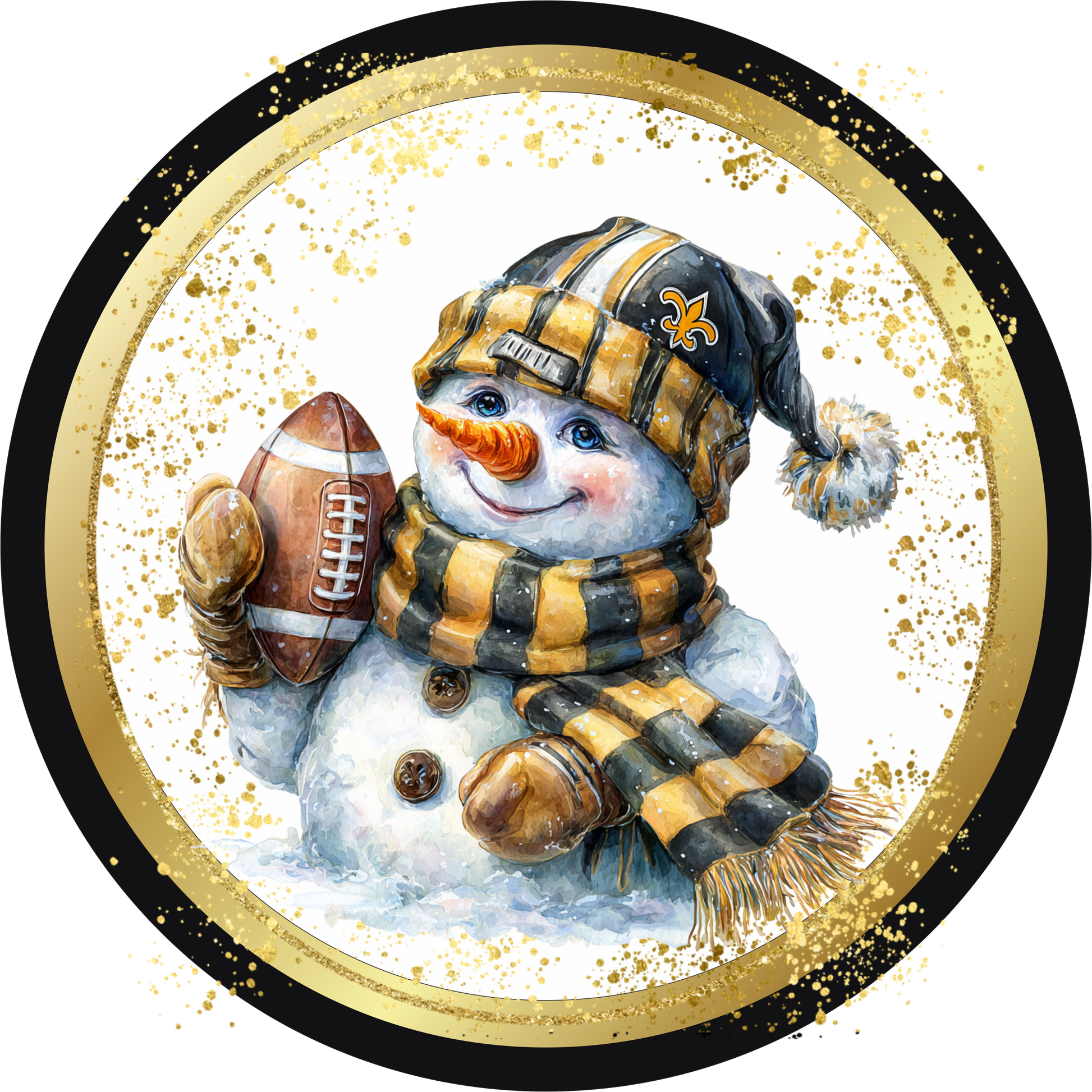 Black and Gold Themed Gold Helmet Snowman holding a football Round Sign